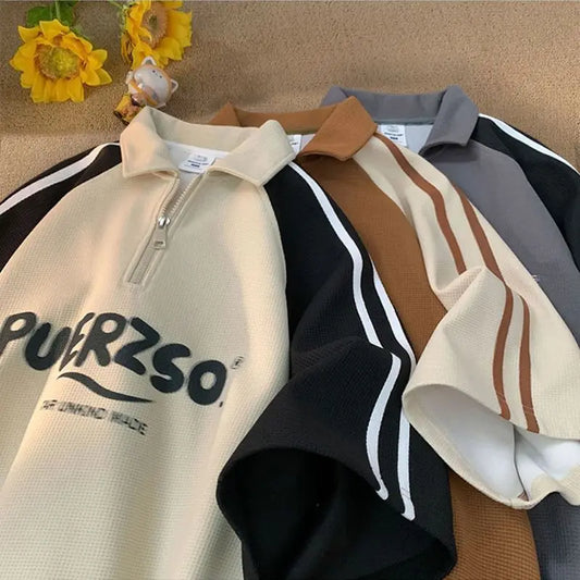 Summer Hip Hop Men and Women Trendy Personalized Waffle Half Zipper Retro Design Polo Collar Short Sleeve Couple Casual T-shirt